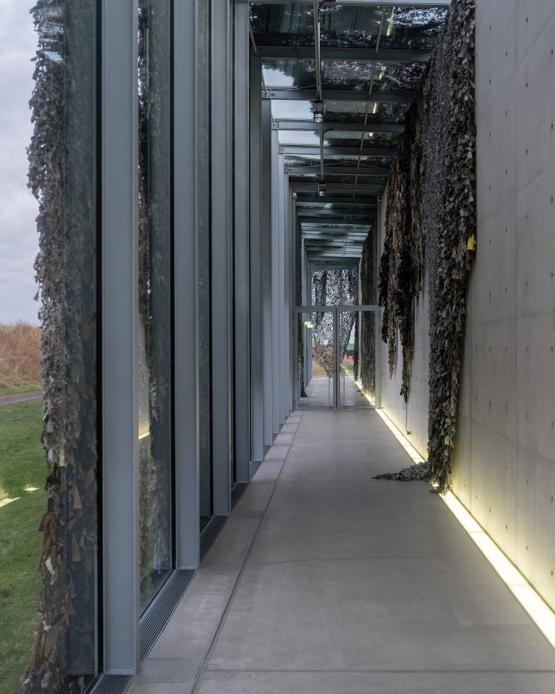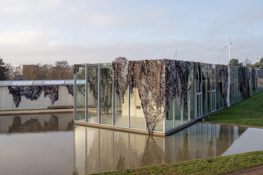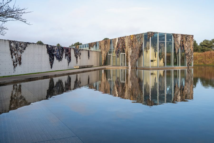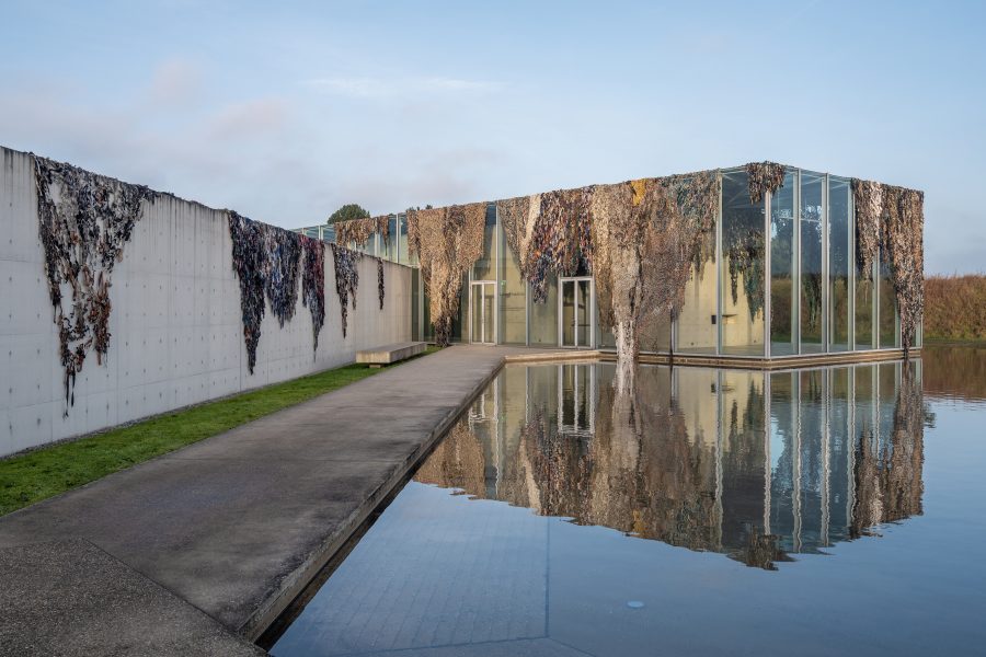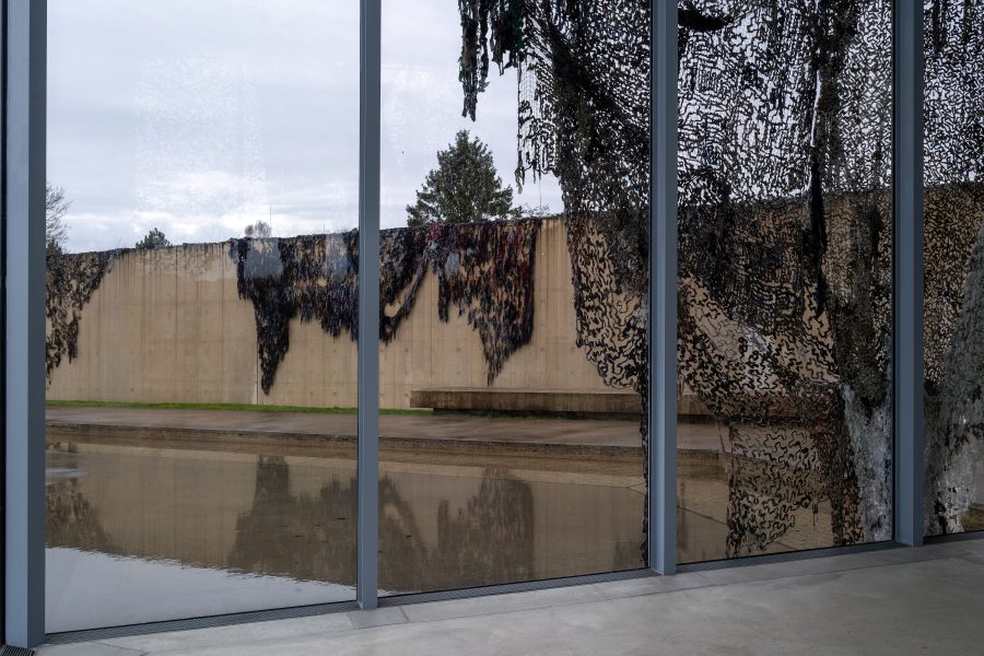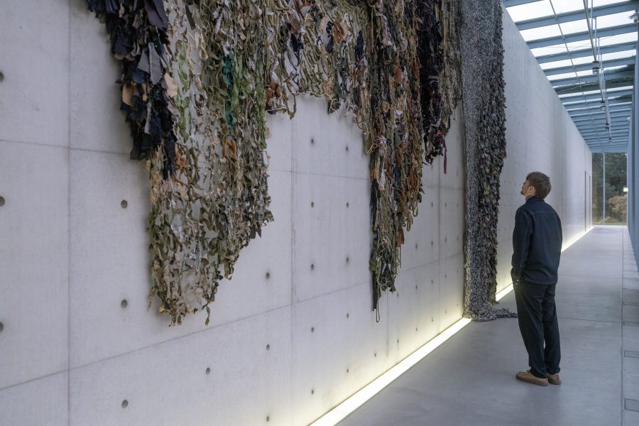 Mit Der Weg des größten Widerstandes kündigt die Langen Foundation eine großformatige Installation des deutschen Künstlers Fabian Knecht an. Der Künstler verhüllt das Museumsgebäude mit zahlreichen Tarnnetzen aus Kleidung und Alltagsstoffen ukrainischer Zivilist:innen und bringt damit eine materielle Spur von Krieg und zivilem Widerstand nach Neuss.