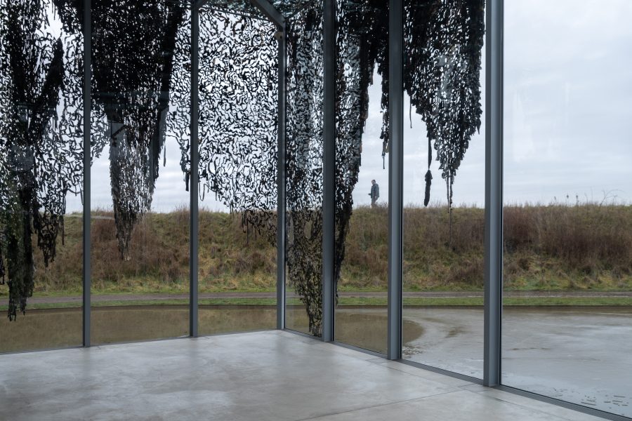 Das für die Langen Foundation entwickelte Werk bezieht sich zudem auf die Geschichte des Ortes: Während des Kalten Krieges war die Raketenstation Hombroich selbst mit Tarnnetzen bedeckt. Knechts Installation tritt in einen vielschichtigen Dialog mit der Architektur von Tadao Ando, indem sie Teile der Glasfassade, des Glasdachs und des inneren Betonkubus partiell verhüllt. Die Installation entfaltet sich im Innen- und Außenraum und kontrastiert organische, textile Strukturen mit der präzisen Geometrie des Sichtbetons. Ergänzend wird eine Fotografie einer früheren Installation Knechts aus dem Jahr 2017 (Ukraine) gezeigt.